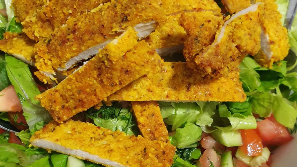 סלט ירקות עם חזה עוף בציפוי קמח שקדים