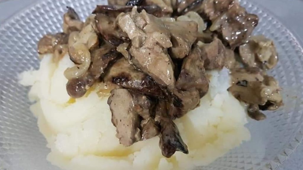 כבד בבצל ורוטב פטריות על מצע פירה ואורז